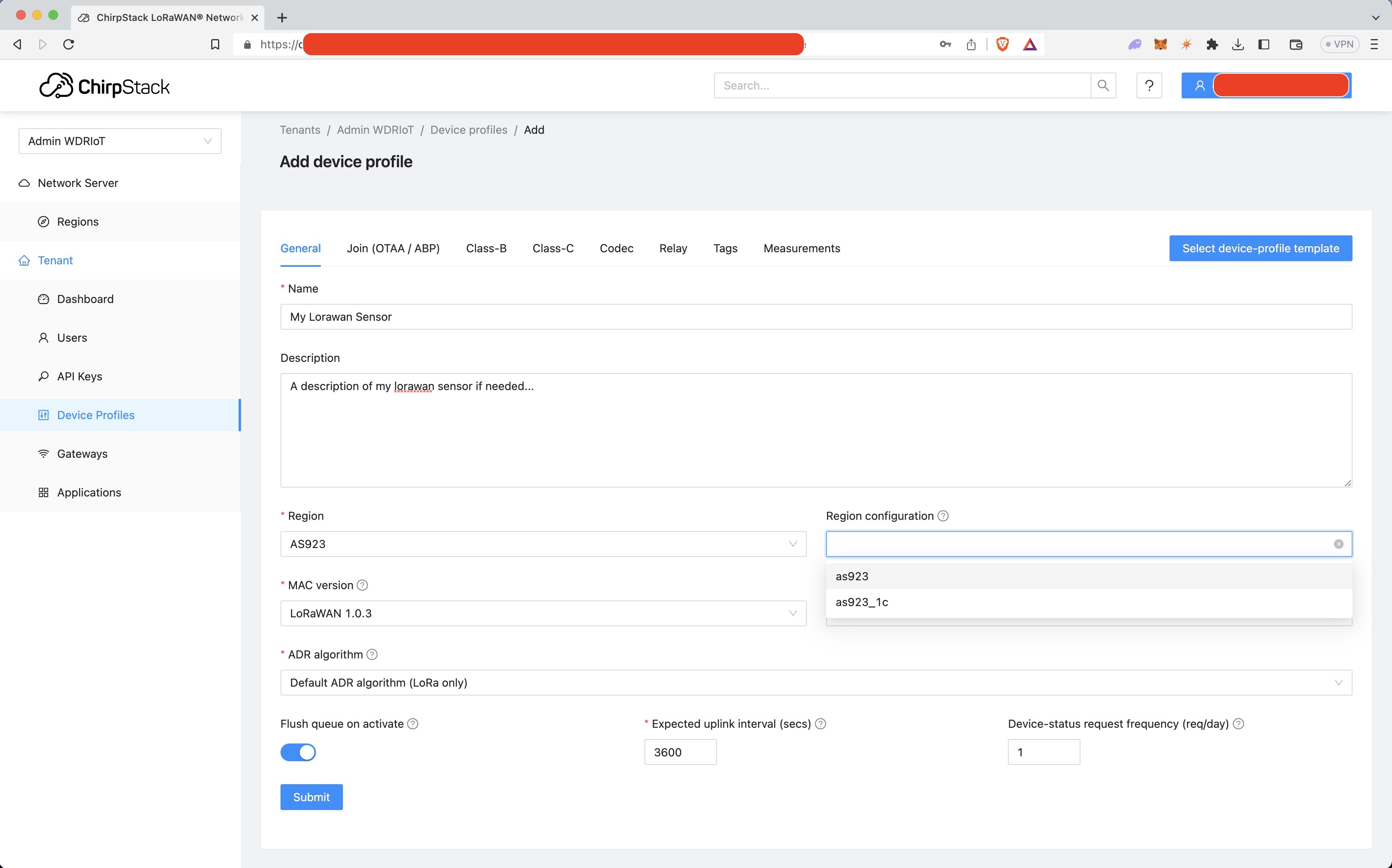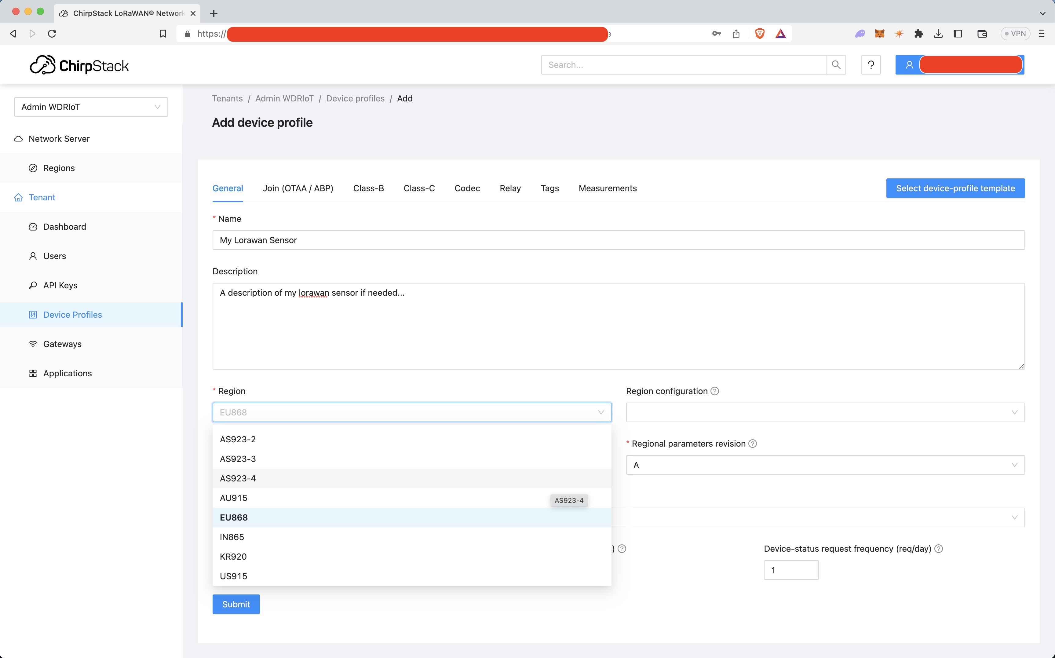 Fill in your device details and select the device profile you made earlier. A Device EUI can be