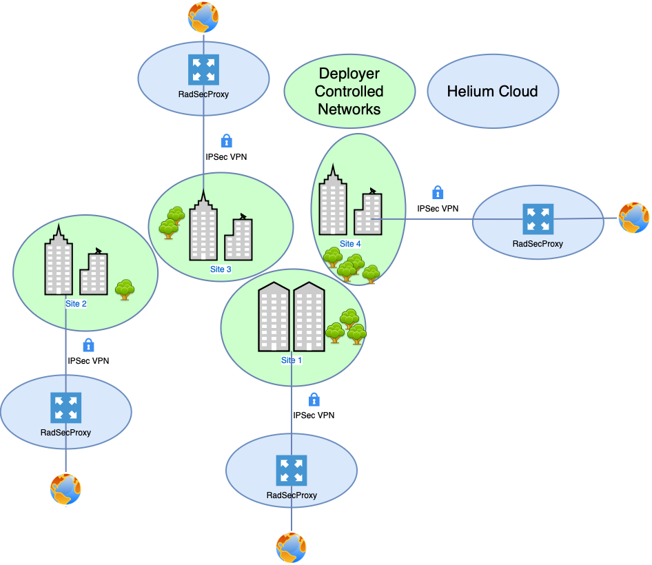 In this deployment model the Deployer has multiple remote sites, each of which are connected directly to the internet with no secure link back to a central office location. In this scenario the deployer can purchase access to a cloud hosted instance of RadSecProxy managed by Helium. Each site is then connected to the cloud instance using an IPsec VPN to secure the link.