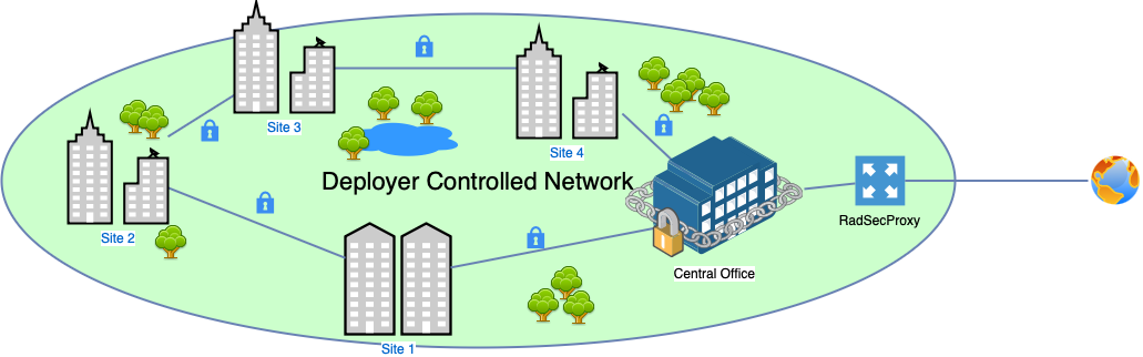 In this deployment model the Deployer has existing secure links between it's remote sites and a central office where common infrastructure is housed. In this case, the RADIUS from WiFi APs at the remote sites is secured back to central office where an instance of RadSecProxy can be deployed. This one instance of RadSecProxy can then be used by all the APs in remote sites 1 - 4.