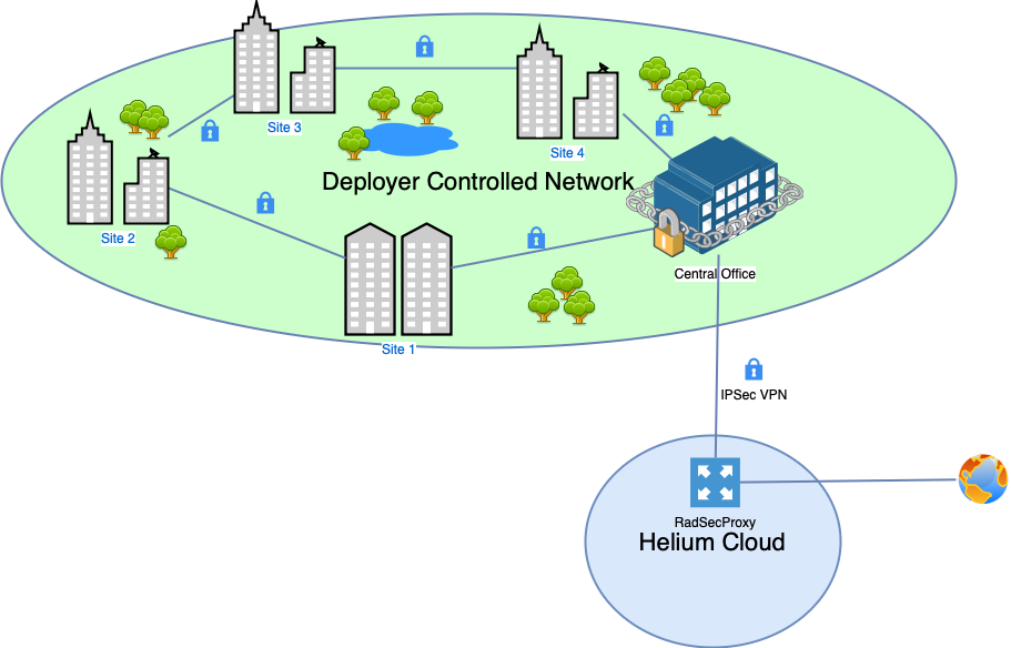 In this deployment model the Deployer has existing secure links between it's remote sites and a central office where common infrastructure is housed. However the deployer is unable to deploy a local instance of RadSecProxy. Instead the Deployer can purchase access to a cloud hosted instance of RadSecProxy managed by Helium. The deploy then establishes an IPsec based VPN link to the cloud RadSecProxy.